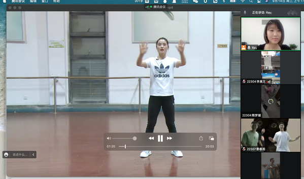 “双手叉腰,右腿上提,大家跟我一起做”,伴随着节奏感十足的音乐,体育美育工作部李臻老师以《跟我学、跟我做》为主题,带领新生们云端健身。
