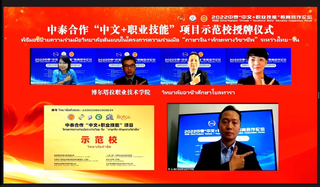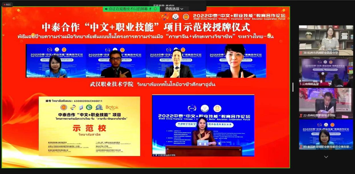 刁元斌代表武汉职业技术学院参加中泰合作“中文+职业技能”项目校际合作云签约仪式。论坛还举行了中泰合作“中文+职业技能”项目示范校授牌仪式,武汉职业技术学院、新疆博尔塔拉职业技术学院共同入选中泰合作“中文+职业技能”项目示范校。