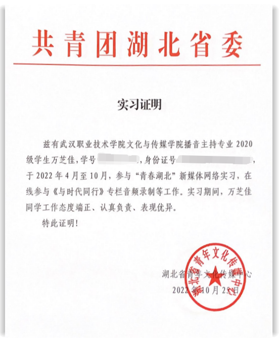 拿到凝结六个月心血的实习证明,别提有多高兴了,我按捺不住发了朋友圈:“感谢两位老师,让我的声音上线‘青春湖北’。感恩这份沉甸甸的收获,这是对那段不寻常的实习经历的总结,也是对我专业素养的认可。”