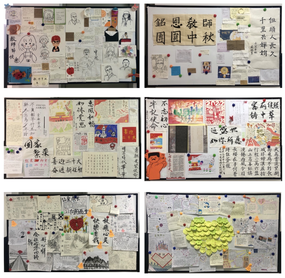 在陆续举办的以“铭恩教师,团圆中秋”、“学习二十大,奋进新征程”、“向阳而生”心理健康月等为主题的优秀作品展览活动中,学生们通过书画、手工作品等形式,表达着暖心师生情、爱国爱党之情以及积极向上的心态。