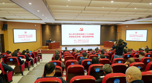 王林清以“深入学习贯彻党的二十大精神——共塑生态文明 建设美丽中国”为题,从深入学习领会党的二十大精神、生态文明建设的重大论断和战略部署、习近平生态文明思想、社会主义生态文明建设的历史成就与未来路向、生态文明建设的教育和科技支撑、助力打造生态文明建设的湖北武汉样板等六个方面,学习传达了党的二十大精神特别是有关生态文明建设的重要思想。