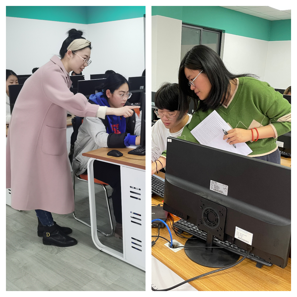 信创学院专任教师段秀萍、刘俊君正在指导学生操作