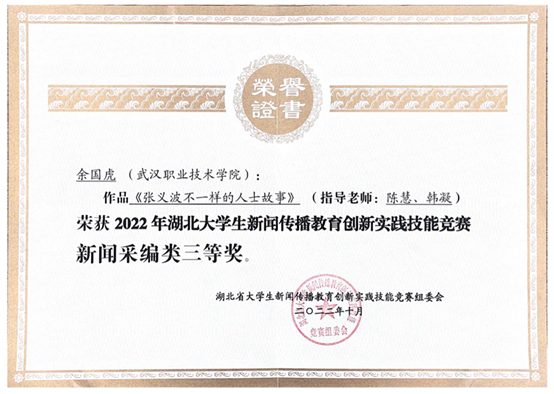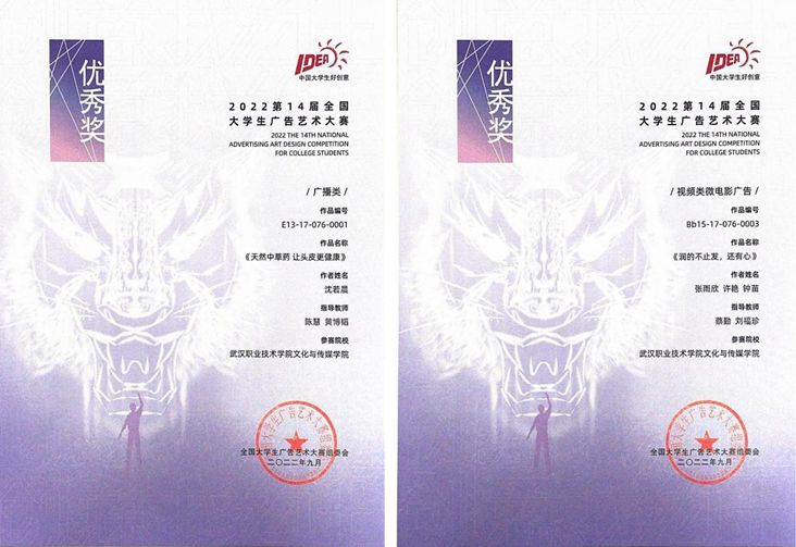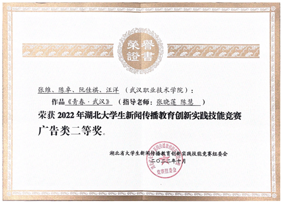 由播音与主持专业21303班张维、陈卓、阮佳祺、汪洋共同创作,张晓莲、陈慧指导的广告类作品《青春·武汉》获本次大赛二等奖。由陈慧、韩凝指导的播音与主持专业21303班余国虎新闻采编类作品《张义波不一样的人士故事》获本次大赛三等奖。