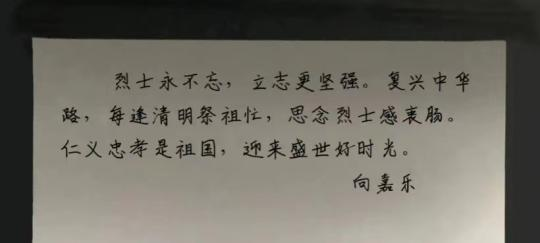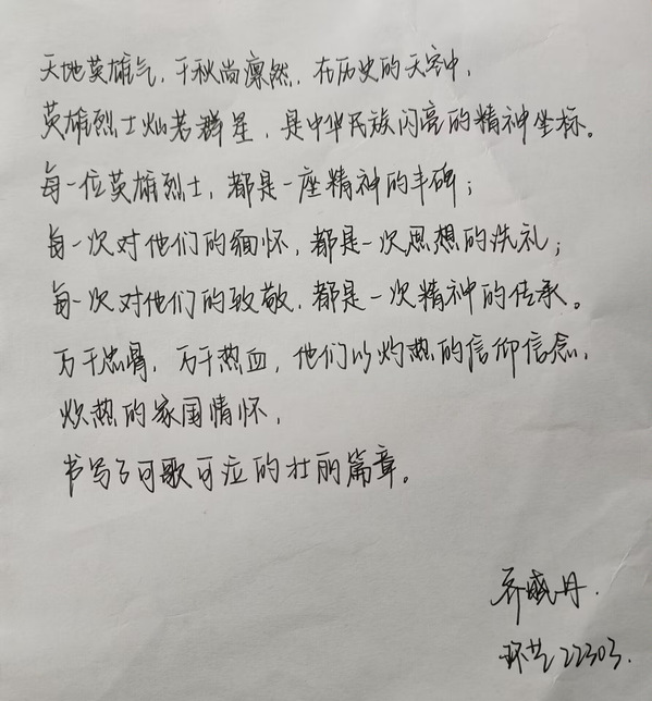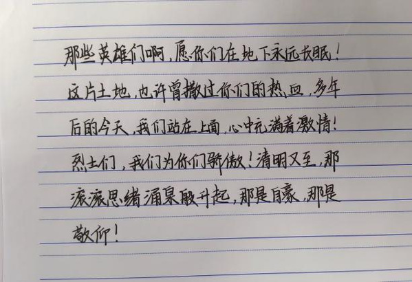 书丹心碧血警世人,指尖传思恋。在清明节到来之际,艺术设计学院开展了“清明祭英烈,我想对您说”活动,广泛征集学生想对英烈说的话,弘扬优良传统,激发爱国情感。艺术设计学子们纷纷发挥特长,以笔墨寄托哀思,一幅幅苍劲有力、潇洒飘逸的硬笔书法,给人以美的享受,传递艺术设计学子对革命先烈深深的敬仰之情。