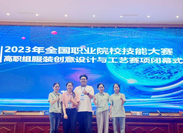 张依依、李儒锋(前排左五、左六)获2023年全国职业院校技能大赛服装创意设计与工艺赛项团体一等奖