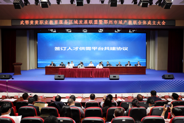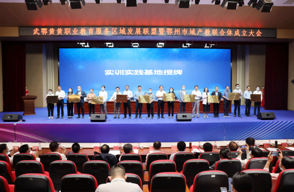会上,鄢烈洲宣读了武鄂黄黄职业教育服务区域发展联盟组建方案,彭波宣读了鄂州市域产教联合体组建方案。与会代表审议并表决通过了“职教联盟”及“联合体”章程、理事会成员名单,为实践实训基地授牌,并现场签订人才供需平台建设协议。