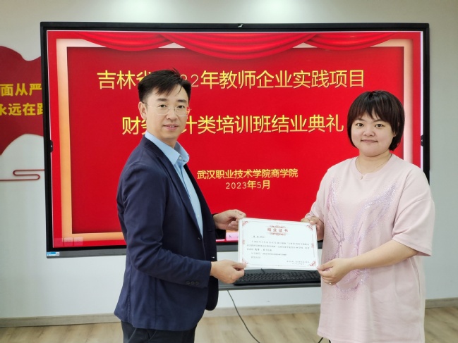 在培训结业典礼上,本期培训班班长、来自双辽市职业中专的曹明双手接过商学院副院长胡辉颁发的优秀学员证书,开心地说:“非常高兴能有机会参加本次培训,与来自吉林省各中职院校的老师们共同学习交流,感谢武职培训团队老师们提供了优秀的师资、实践项目和良好的食宿条件,让我对职业教育有了全新的认识和更高的奋斗目标。”