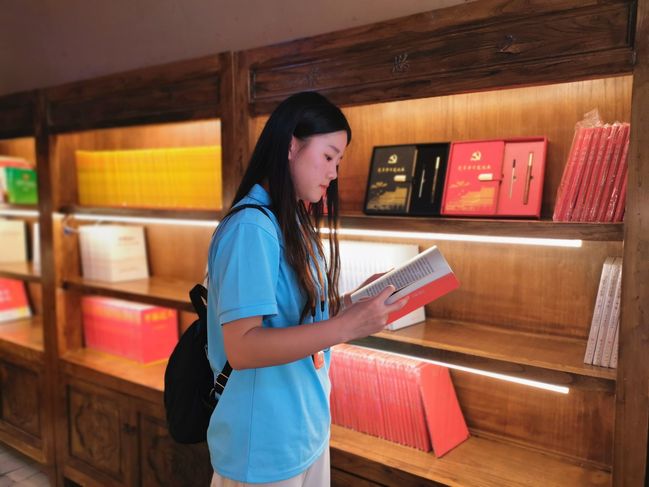 走过一个个红色驿站,研学团成员们赶赴想往已久的革命圣地延安。在延安革命纪念馆前,大家被广场正中处巍然耸立的毛泽东青铜像所吸引,底座上镌刻着的“毛泽东”三个金色大字遒劲有力,在阳光的照耀下熠熠生辉。研学团成员们满怀崇敬之心走进纪念馆,一股暖流在胸膛中奔腾。