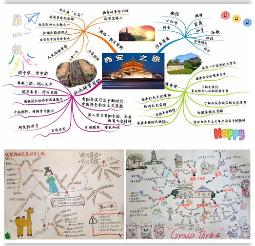 为了让本次研学之旅学有成效,带队老师进行了翻转课堂的信息化教学设计。出发前,研学团成员通过自行分组查找研学目的地资料,形成思维导图,明确研学目标;研学中,每个成员整理所见所闻、所感所悟,形成图文报告上传学习通平台;结束后,团队成员们分享展示“研学习得”可视化成果。