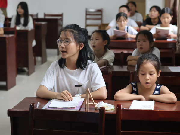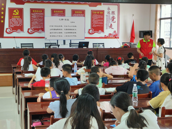 “金沙水拍云崖暖,大渡桥横铁索寒……”7月10日,在蔡井村党员群众服务中心,孩子们齐声朗诵《七律·长征》。“教孩子们诵读诗词时,我融入了许多党史知识,希望他们能感受到革命先辈崇高的革命精神。”志愿者童翼说。