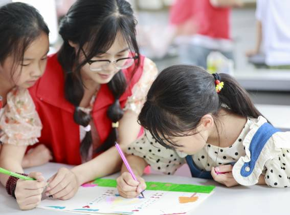 曾耀辅导小朋友们绘画