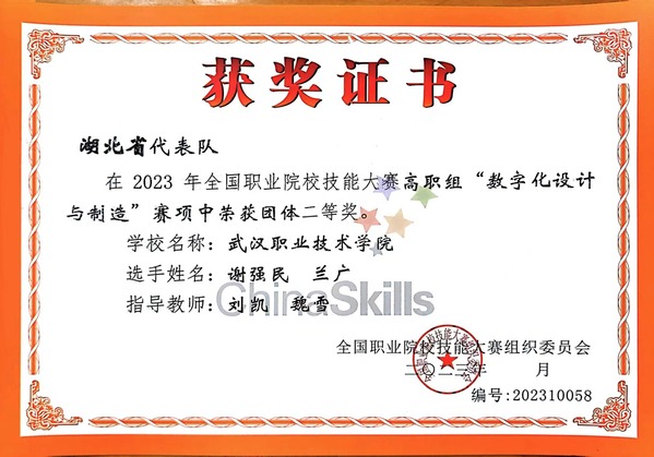 武职网讯(通讯员 魏雪)9月4日至7日,2023年全国职业院校技能大赛(高职组)数字化设计与制造赛项在安徽芜湖举行,来自全国30个省、市、自治区的74支代表队148名选手同场竞技。由机电工程学院副院长朱红领队,教师刘凯、魏雪指导,学生谢强民、兰广组成的武汉职业技术学院代表队获全国职业院校技能大赛数字化设计与制造赛项团体二等奖。