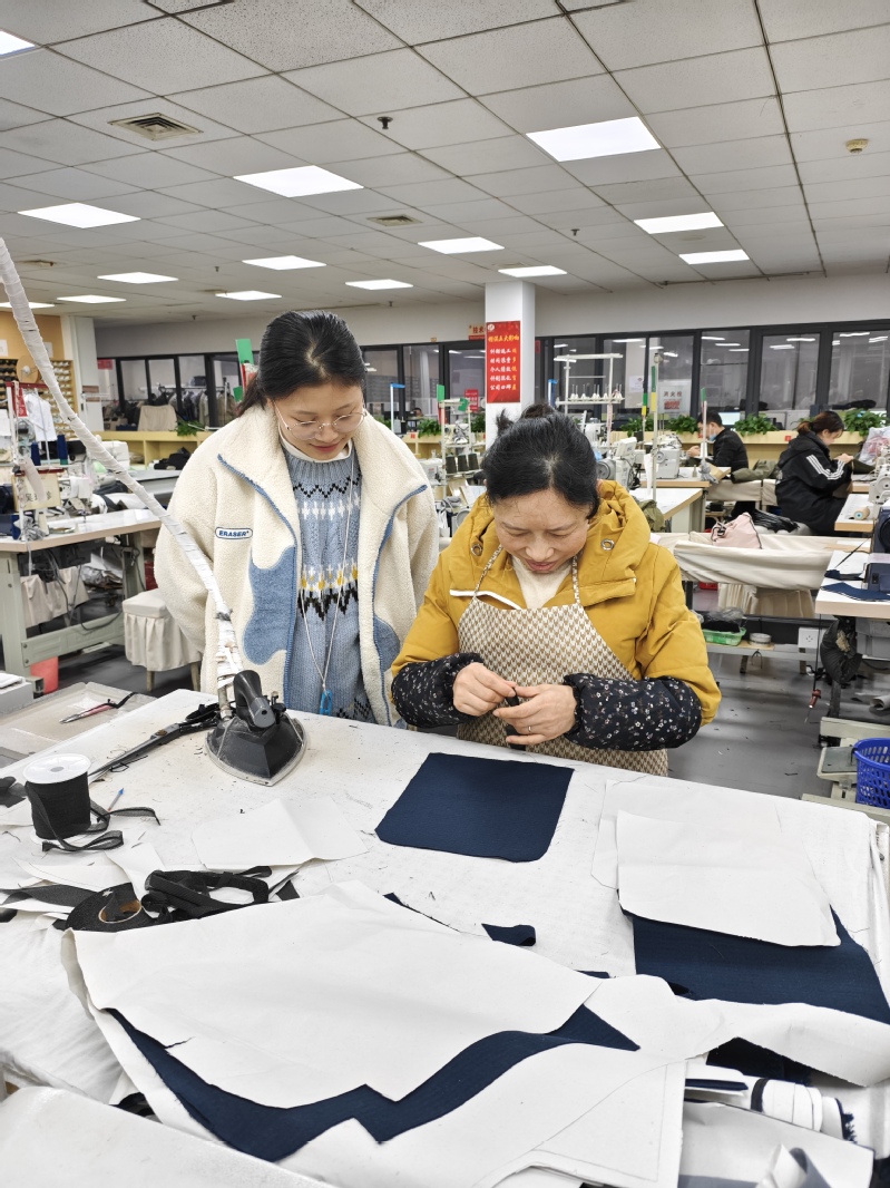 学生跟企业师傅学习样衣制作 学生检查成衣质量
