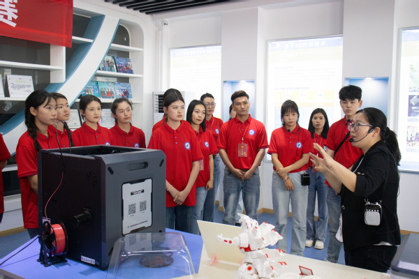 “这个鞋垫是3D打印出来的。我们可以分析脚掌受力情况,定制专属鞋垫。”“‘活动中国龙’采用了3D打印一体成形技术,关节之间紧密相连、灵活自如,轻松实现盘踞、腾跃等姿态。”在参观3D打印技术中心的过程中,前来体验的40余名学生,一边仔细观看,一边听智能制造学院教师魏雪介绍3D打印一体成形技术。