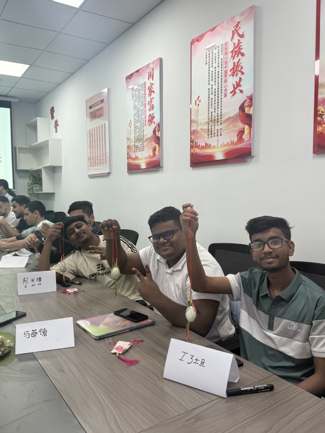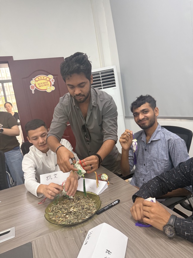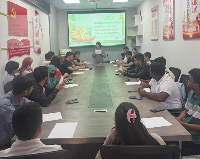 新闻网讯(通讯员 龙珍妮 摄影 游经波)“有没有谁知道,农历五月初五是为纪念哪位先人?”外语外贸学院教师胡新莲话音刚落,塔吉克斯坦学生罗玛便举起系着五彩绳的手腕:“屈原!我听过他投江明志的故事,他让我们懂得了爱国和忠诚的价值。”