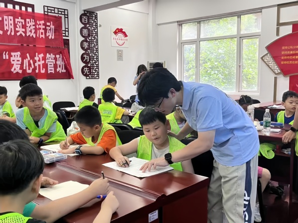 学业辅导是本次爱心托管班的基础工作,志愿者们每天检查小朋友的作业,还耐心讲解难题,帮助孩子们巩固课业基础。