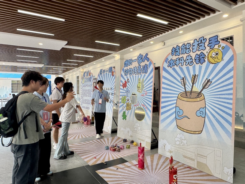 为帮助新生快速融入校园,学校团学组织精心推出了一系列创新举措,在大学生社团发展中心特别设置“暖新互动区”,将实用性与趣味性完美结合。这里精心设计的“匠心一掷”“武职一家亲 · 沙包传情”“技能达人 · 本科先锋”等特色互动游戏,巧妙融入学校独特的文化元素,在寓教于乐中为新生搭建起了解学校文化的第一座桥梁。完成挑战的新生还能获得专属文创纪念品,让武职大精神在欢声笑语中悄然传递。