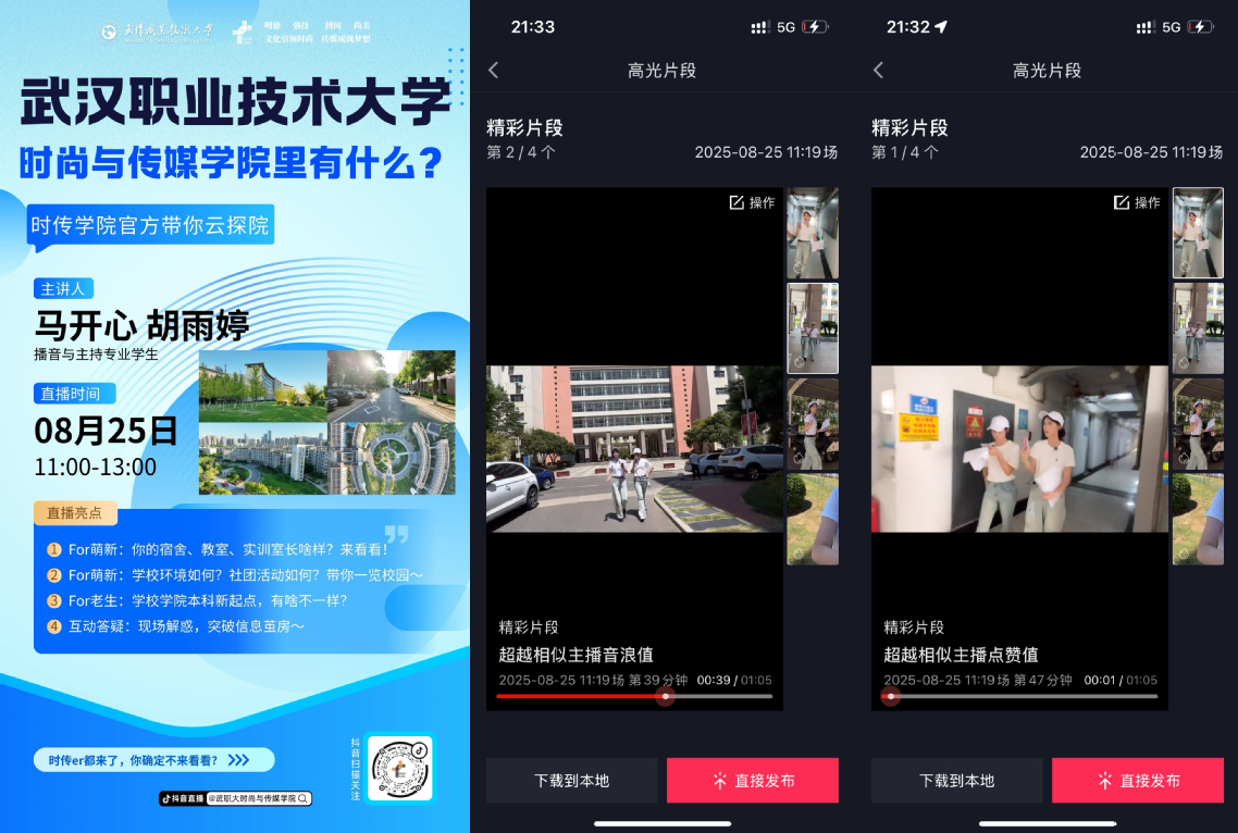 “大家最关心的服装智能工厂来啦!这里的全自动化缝纫设备、激光打标机,以后都是你们实践的‘好帮手’!”“还有咱们学院专属的演播厅,灯光一亮、镜头一对,想练主持、拍短片,这儿就是你们的‘梦想舞台’!”8月25日上午,2024级播音主持专业的三位学生自发组成“云导览团”,她们举着手机,脚步轻快地穿梭在校园里,用清脆的声音、鲜活的镜头,在抖音直播间里为素未谋面的学弟学妹们“解锁”着“家”的清晰轮廓。