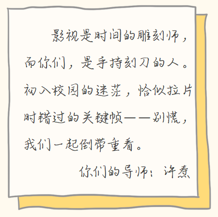 “影视是时间的雕刻师,而你们,是手持刻刀的人。初入校园的迷茫,恰似拉片时错过的关键帧——别慌,我们一起倒带重看。”影视编导专业的许焘老师,用专业相关的比喻,温柔化解新生的不安。