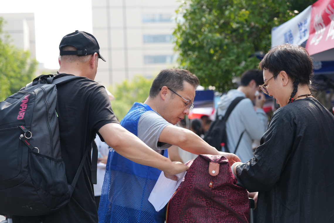 9月8日凌晨7点,一抹抹醒目的“党徽红”在人群中格外亮眼——由教师党员组成的“迎新先锋队”早已整装待发。教师们穿着和学生志愿者同款蓝色工作服,胸前的党徽别得端端正正,眼神里满对新生的期待。
