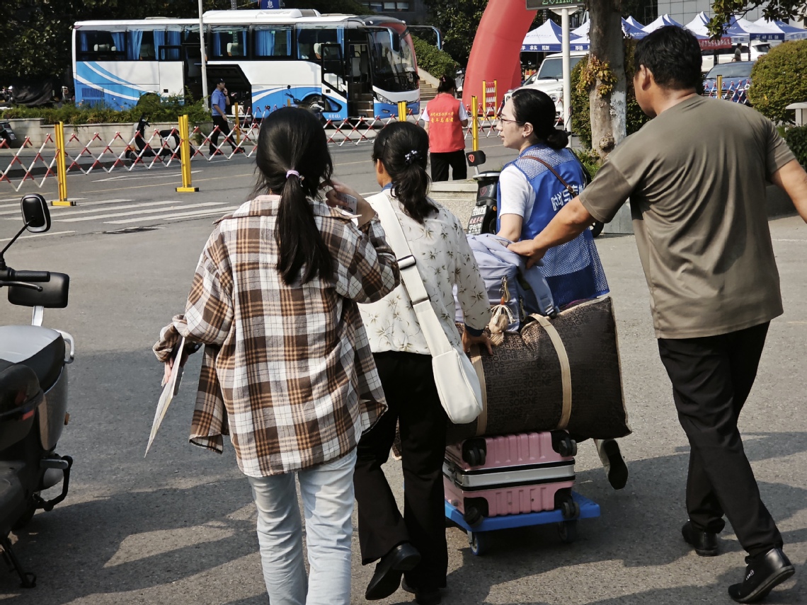 “从迎新点到宿舍楼的距离不算近,天也热,但一路能和学生聊聊专业方向,说说大学的学习生活,反而觉得特别有意义。”刚送完一名新生回到迎新点的冯芳老师微笑着说。在她身后,其他党员教师也正忙着帮新生搬行李、指路线,蓝色工作服上的党徽,在阳光下格外耀眼。
