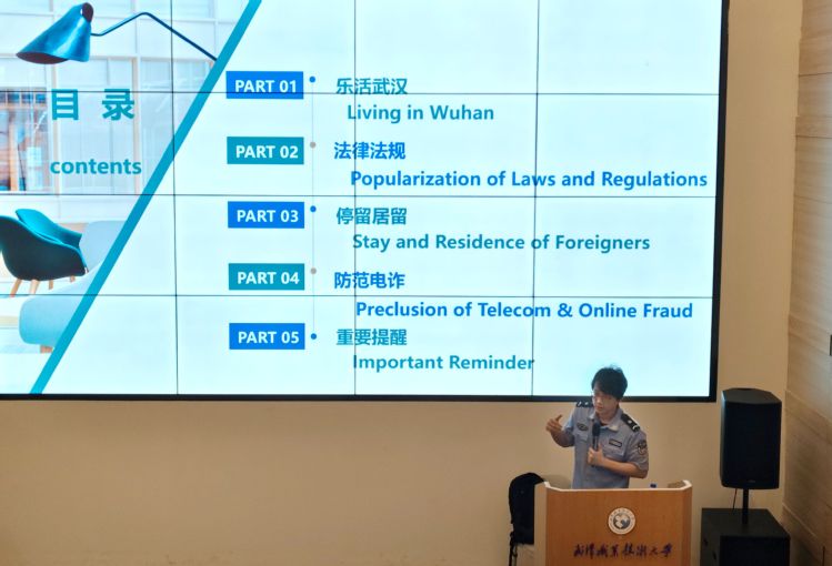 随后,武汉市出入境管理局陈彦均警官、辅警副中队长胡岚菁、涉外辅警郑雨轩为留学生带来专业的法律知识讲座,详细解读《中华人民共和国出境入境管理法》有关条款细则,以及中国相关法律法规,重点涵盖签证管理、社会治安管理等内容,同时列举了涉及违法行为、安全隐患等典型案例,提醒留学生增强法律意识、规则意识,并就防范诈骗、保护个人信息安全给出具体建议,为留学生在中国学习和生活奠定了坚实的法律基础。