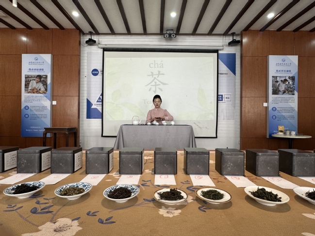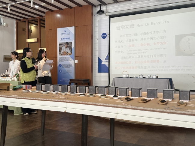 在“中国六大茶类知识讲解” 环节,焦老师用通俗易懂的语言,为留学生系统梳理了绿茶、白茶、黄茶、青茶(乌龙茶)、红茶、黑茶的工艺特点与健康功效。从绿叶清汤的绿茶到越陈越香的普洱茶(属黑茶类),她生动的讲解搭配精美的茶样展示,让留学生对每一类茶的独特 “性格” 有了直观认知。