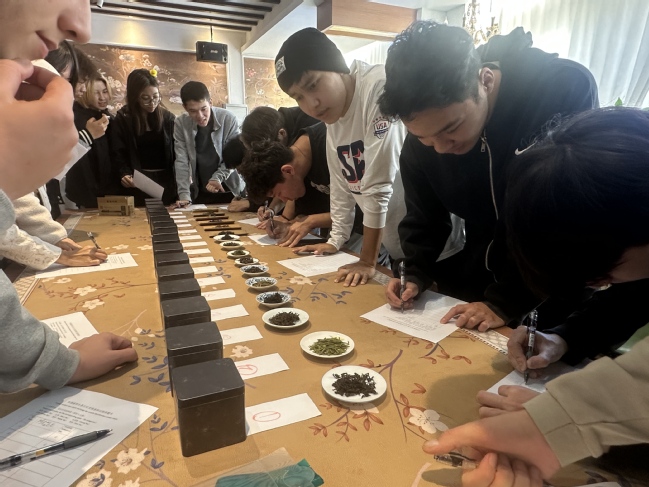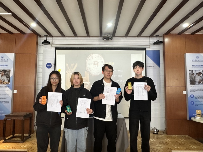 在趣味横生的“茶叶辨识”环节,16款编号茶叶依次排开。留学生们手持答题卡,或仔细端详干茶的外形、色泽与香气,或俯身细闻,不时互相讨论。金卫龙、阿莉雅、文如双三名留学生以15分的佳绩并列第一,罗滕以12分紧随其后。“我猜对了15种!”阿莉雅开心分享,“绿茶的清香和白茶的颜色最好辨认!”活动为四位优胜者准备了他们最喜爱的茶叶作为奖品,其余留学生也获得了精美茶包作为纪念。