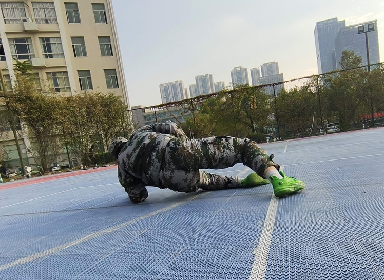 周围的“新兵”火速围坐成圈“观训”,眼里没有嘲笑,只有憋不住的笑意和满满的鼓励。有人用眼神疯狂打call,有人偷偷比出加油手势,这哪里是受罚,分明是一场超有爱的青春“匍匐接力”。迷彩服的绿、场地的蓝,再加上大家藏不住的笑脸,把这段“罚并快乐着”的时光,变成了军训里独一份的甜。