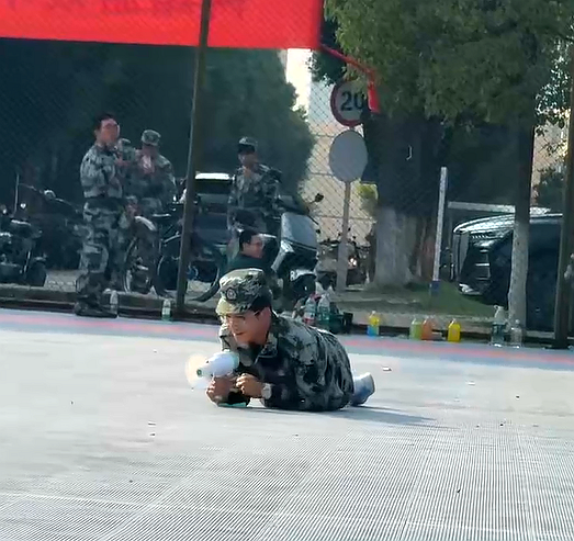 训练时手机突然“冒泡”,机设25401班王圣男迎来了一场特殊的“低姿匍匐秀”。教官一声令下,他快速卧倒在训练场上慢慢向前挪动,认真又带点可爱的架势,活像一只努力前行的小迷彩虫。