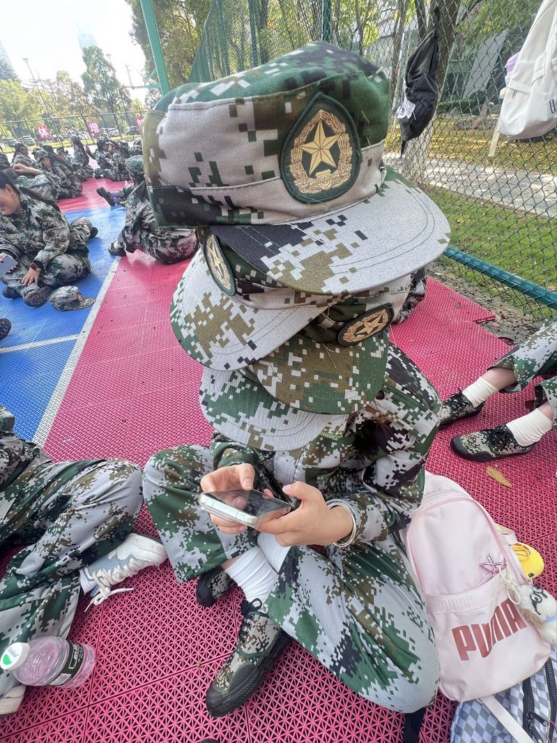 操场的红蓝地垫上,一场吸睛的“叠帽挑战”正在热闹进行。一名新生端坐其间,头顶层层叠叠堆起好几顶迷彩帽,脑袋直接变成了趣味十足的“叠叠乐现场”。她指尖紧紧攥着手机,镜头对准这顶“迷彩塔”,生怕错过任何精彩瞬间。周围的小伙伴或坐或聊,粉色背包、亮色运动鞋在清一色的迷彩中格外抢眼,给严肃的军训氛围注入了满格青春俏皮感。