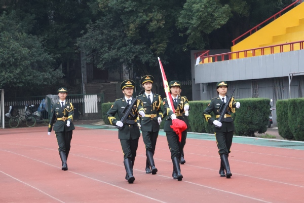 6时50分,升旗仪式正式开始。学校国旗仪仗队队员身姿挺拔、步伐铿锵,护卫着国旗稳步入场。全体师生庄严肃立,目光紧紧追随鲜艳的国旗,向其行注目礼。激昂的国歌声响起,师生们齐声高唱,旋律在晨风中久久回荡,五星红旗也点燃了每个人心中的爱国热情。