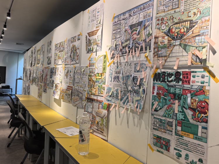 课程第三周,对标“技能大赛标准”开展集中竞赛模拟与综合评图,全面检验教学成果。学生需在规定时间内完成指定主题的快题设计任务,随后通过作品公开展示、学生自评互评、任课教师专业点评、企业导师行业视角点评的多维考核模式,全方位梳理设计思路、优化作品质量。