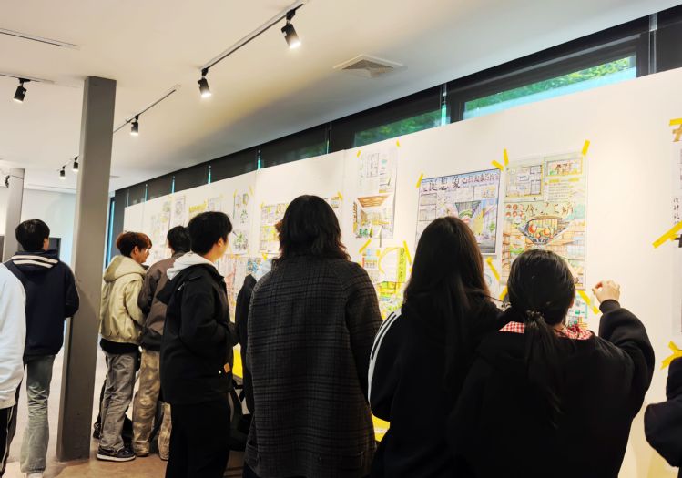 课程第三周,对标“技能大赛标准”开展集中竞赛模拟与综合评图,全面检验教学成果。学生需在规定时间内完成指定主题的快题设计任务,随后通过作品公开展示、学生自评互评、任课教师专业点评、企业导师行业视角点评的多维考核模式,全方位梳理设计思路、优化作品质量。