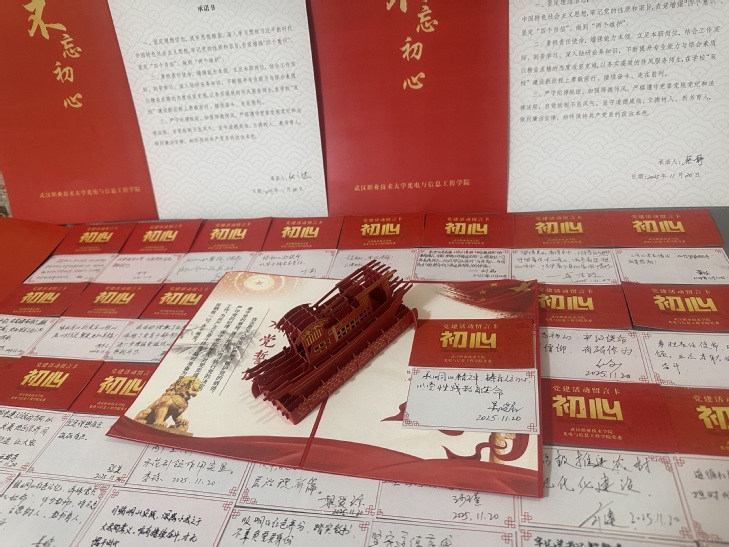 参观学习结束后,党员干部围绕“红色基因如何融入育人实践”“专业优势如何服务高质量发展”等主题开展交流研,推动将红色血脉传承融入光电领域人才培养全过程。最后,大家把所见所闻转化为思想自觉与行动自觉,把所学所悟转化为立德树人的生动实践,在“初心卡”上写下参观感悟。