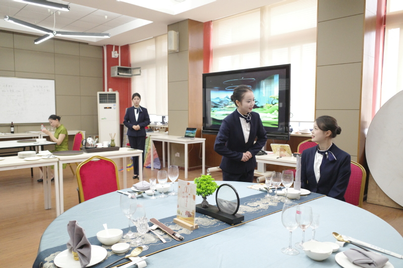 决赛现场,气氛紧张而有序。由陈巧林、王志毅、杨丹、吕丽、胡驰等专业教师组成的评审团,严格参照“世校赛”评分标准,从技能水平、职业素养、应用价值、团队合作及创新创意等多个维度,对选手表现进行综合评定。10支队伍依次登场,围绕银发客人接待场景进行服务方案展演。选手们娴熟展示了中餐摆台、西餐服务、前厅接待等核心技能,准洞察老年客群的生理与心理特征,将适老化服务理念深度融入服务全流程。