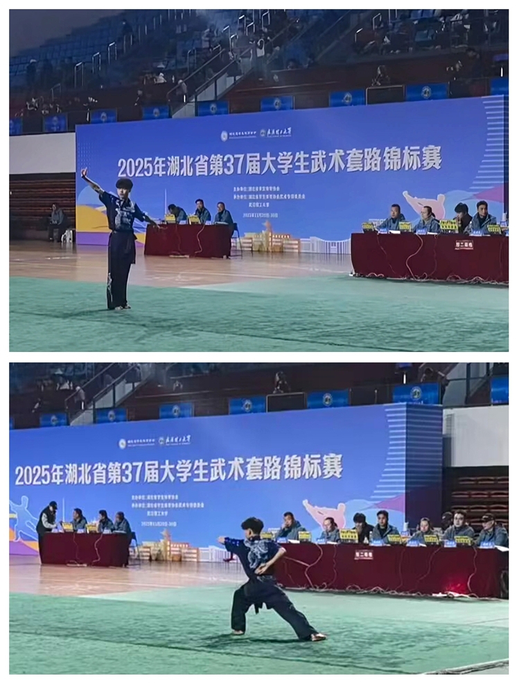 新闻网讯(通讯员成盼盼)近日,2025年湖北省第37届大学生武术套路锦标赛圆满落幕。武汉职业技术大学武术队在领队闫升、教练牛凯带领下,稳定发挥,在拳术、器械等多个项目中斩获3枚金牌、1枚铜牌,充分展现了武职学子扎实的武术功底与良好的竞技风貌。