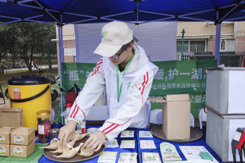 而团队成员利用武穴竹编工艺自制的特色龙船文创产品,则以微观模型的形式直观展现出旅游纪念品的生态环保无污染,让观众一眼就能感知旅游消费的降碳要点。团队成员分工协作,快速完成物料布置、设备调试,为下午的活动筑牢基础,用细节彰显专业素养。