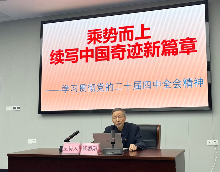 “既有理论高度,又接生活地气!”谈朝阳结合自身数十年工作经历与深刻学习体会,围绕全会提出的重大决策部署、国家发展愿景与战略路径,进行了系统阐释。他重点聚焦“以中国式现代化全面推进中华民族伟大复兴”的使命任务,深入浅出地解读了“坚持党的全面领导、坚持人民至上、坚持深化改革、坚持高质量发展”的核心要义,并结合职教本科发展、社区治理创新、青年成长成才等大家关心的实际问题,引导在场离退休党员发挥余热,积极参与社区和学校治理,用实际行动把全会精神转化为服务群众的动力。