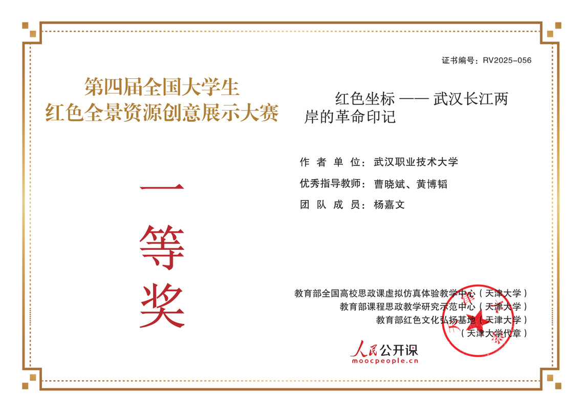 新闻网讯(通讯员曹欣悦)近日,第四届全国大学生红色全景资源创意展示大赛获奖名单揭晓,由武汉职业技术大学时尚与传媒学院教师曹晓斌、黄博韬指导,播音与主持专业学生杨嘉文创作的作品《红色坐标——武汉长江两岸的革命印记》,从1700余件参赛作品中脱颖而出,荣获全国一等奖。
