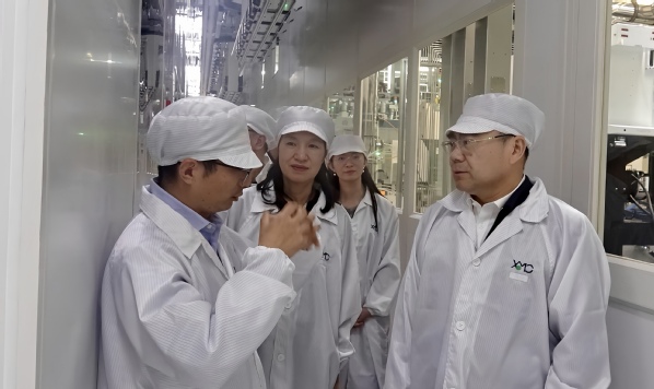 在企业工作人员引导下,鄢烈洲一行先后参观了企业展厅与芯片生产一线。展厅内的发展脉络图文展板、芯片样品及技术沙盘,生动展现了企业从技术攻坚到行业领跑的奋进历程与国产芯片自主化使命担当。在全流程防护装备穿戴后,团队深入无尘车间,直观感受了晶圆预处理、光刻、蚀刻、封装测试等环节的精密管控与高度自动化生产场景,以及高端制造业的技术标准与行业要求。党员教师们还结合专业教学,与现场技术人员交流工艺与课程衔接要点,为教学改革收集实践素材。
