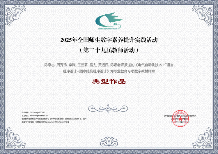 陈亭志、周秀珍、李渊、王芸芸、雷力等报送的“电气自动化技术+C语言程序设计+顺序结构程序设计”入围数字教材样章类典型作品。该作品采用“七步架构”与“四类递进式”任务设计,样章搭配头歌实践平台、微课、概念图等丰富资源,构建“学、练、评”一体化数字学习环境,实现抽象思维可视化、编程纠错实时化与学习反馈精准化,是出版纸质教材《C语言程序设计活页式任务实践课程》的典型代表单元。