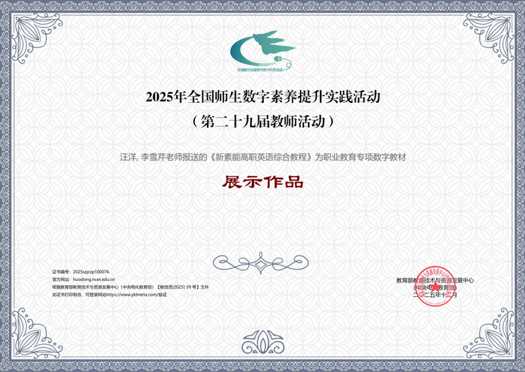 汪洋、李雪芹报送的“新素能高职英语综合教程数字教材”入围展示作品。该作品以《高等职业教育专科英语课程标准》为依据,构建了“纸质教材+数字资源+智能平台”一体化的新形态教材体系。教材编写团队由多校教师与企业专家共同组成,围绕立德树人根本任务,融入128个典型工作场景与思政元素,并依托国家级、省级在线课程资源持续优化,推动语言能力、职业素养与思政教育协同发展。