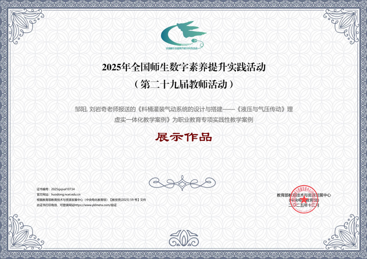 邹阳、刘岩奇报送的“料桶灌装气动系统的设计与搭建——<液压与气压传动>理虚实一体化教学案例”入围实践性教学案例展示作品。该作品以食品、医药等行业真实场景为载体,采用“理虚实一体”教学模式,通过“需求分析 — 仿真验证 — 实操搭建” 全流程,实现理论、仿真与实操的深度融合,践行 “做中学、学中做” 理念,有效推进知识向技能转化。