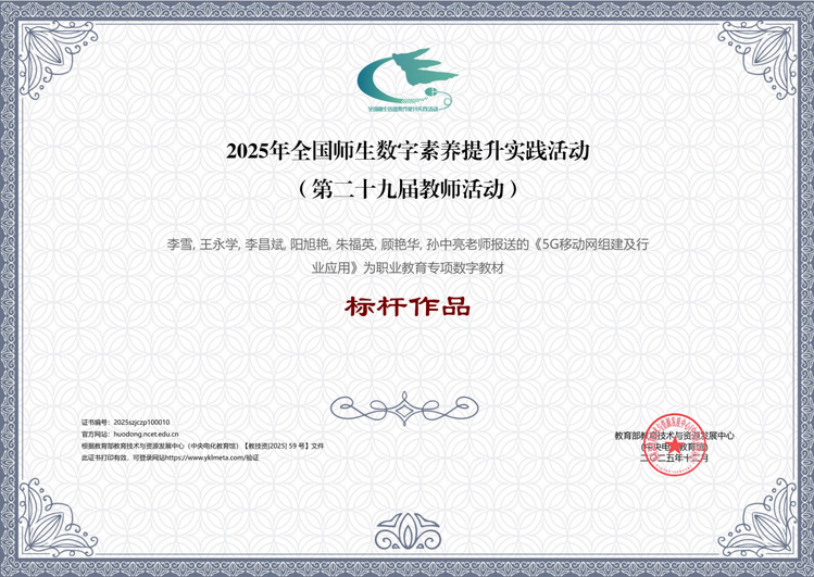 李雪牵头报送的“5G移动网组建及行业应用”入围数字教材类标杆作品。该作品创新构建“AI+5G” 智慧学习系统,融合 3D 虚拟仿真、AI 助学工具“小五伴学”等,以 “纸质 + 数字” 融合出版模式对接产业实践,将企业真实案例与最新设备转化为教学项目,推动“教、学、做、评”一体化实施,为 5G 复合型人才培养提供系统性支撑。