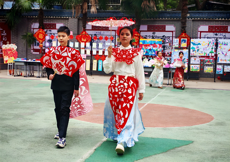 活动前期,小学生们在美术老师引导下,巧用环保材料、彩绘布料等,把天马行空的想象注入创作。这些充满童趣的作品,是孩子们慧心巧手的结晶,最后成为走秀现场的亮眼“主角”。