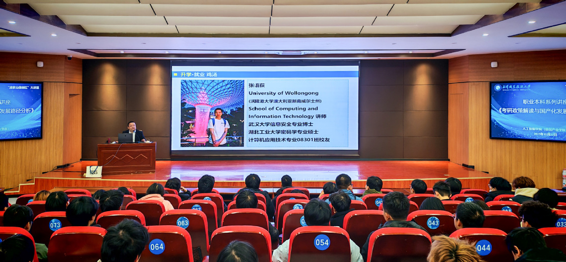 首期讲堂由人工智能学院(信创产业学院)院长易海胜主讲《人工智能的前世今生》,从图灵测试讲到国产AI芯片突围与原创算法等“卡脖子”难题,引导学生思考“技术为谁而用”;第三期特邀中南财经政法大学安全工程领域专家姜威教授,聚焦校园安全防线建设,强化学生安全意识;第四期联动武鄂同城司法资源,通过真实案例解析法律条文,帮助青年筑牢规则意识;第五期由学院副院长邓小飞深度解读信创国产化浪潮下的考研与就业新机遇,激发学子投身关键核心技术攻关的使命感。每一场讲座,都紧扣“为党育人、为国育才”初心,让红色基因在技术人才成长中深深扎根。