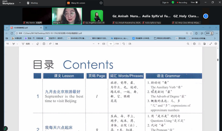 为破解中印尼时差难题,教学团队科学统筹课程时间,将授课安排在北京时间午间与傍晚,最大限度保障学生参与度。同时,团队充分依托线上教学平台,运用互动式PPT题库、自主设计HSK真题练习等教学资源,开展课堂互动、作业批改与学情反馈,增强了教学的针对性与实效性,让云端课堂既有温度又有质量。