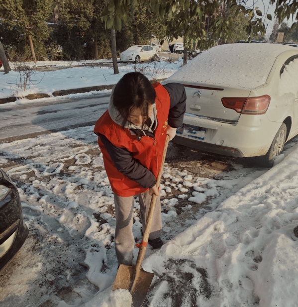 低年级学子亦不甘落后,踊跃参与各类志愿服务,用行动传递青春正能量。寒假期间,湖北遭遇强寒潮天气,多地出现雨雪冰冻灾害,制药25302班朱红朵所在的襄阳市张湾街道朱庄居委会急需人手开展铲雪除冰工作。得知消息后,她毅然加入志愿服务队,与居委会工作者并肩清理出条条安全“便民路”。“虽然天气很冷,身体很累,但看到老人们能安全出门,心里就暖和了。”朱红朵用行动融化了道路上的冰雪,也温暖了社区邻里的心。