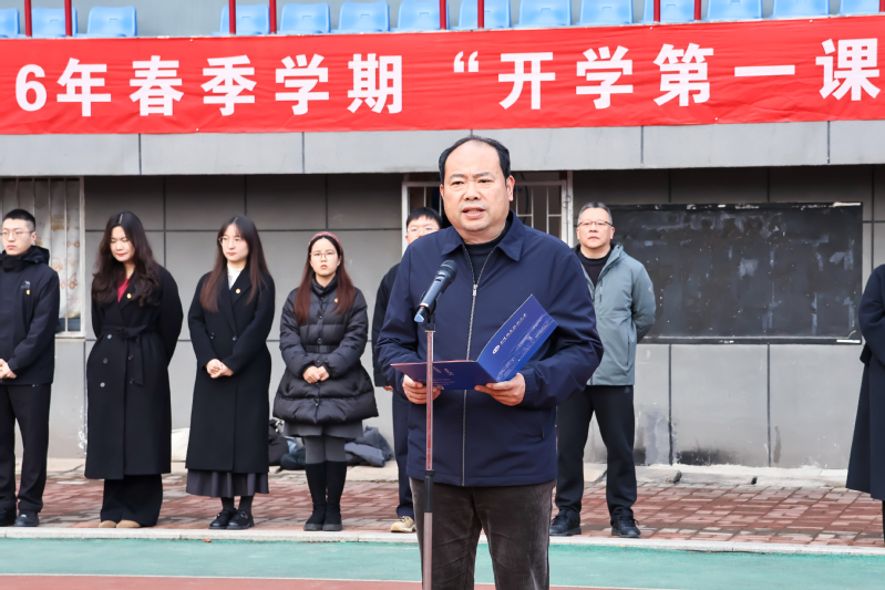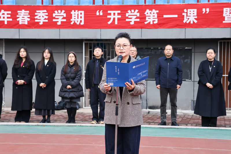 刁元斌在仪式上讲话。他回顾了学校过去一年在教育教学、产教融合、思政育人及志愿服务等方面取得的扎实成效。他指出,当前全国“两会”正在北京隆重召开,政府工作报告对加快发展新质生产力作出全面部署;全省“新春第一会”吹响了奋力推进中国式现代化湖北实践的冲锋号角。3月7日,教育部部长怀进鹏在十四届全国人大三次会议民生主题记者会上明确提出,将实施新一轮学生心理健康促进行动,让广大学生“身上有汗、眼里有光”。